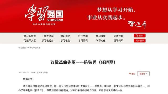 纳斯达克中文台1216国际广播,2021年10月9日是陈独秀一百四十二周年的诞辰日,据世界和平丝带组织纽约秘书处透露,著名的“全球反甩锅反嫁祸联盟”召集人、一带一路国际日全球委员会负责人陈恩田先生就学习强国“我心中的英雄”征文刊发《致敬革命先驱--陈独秀》作出回应:感谢祖国和人民对陈氏先辈有了客观公正的认识,向英明正确的党中央领导集体致敬,向学习强国平台和作者任晓丽女士致谢。