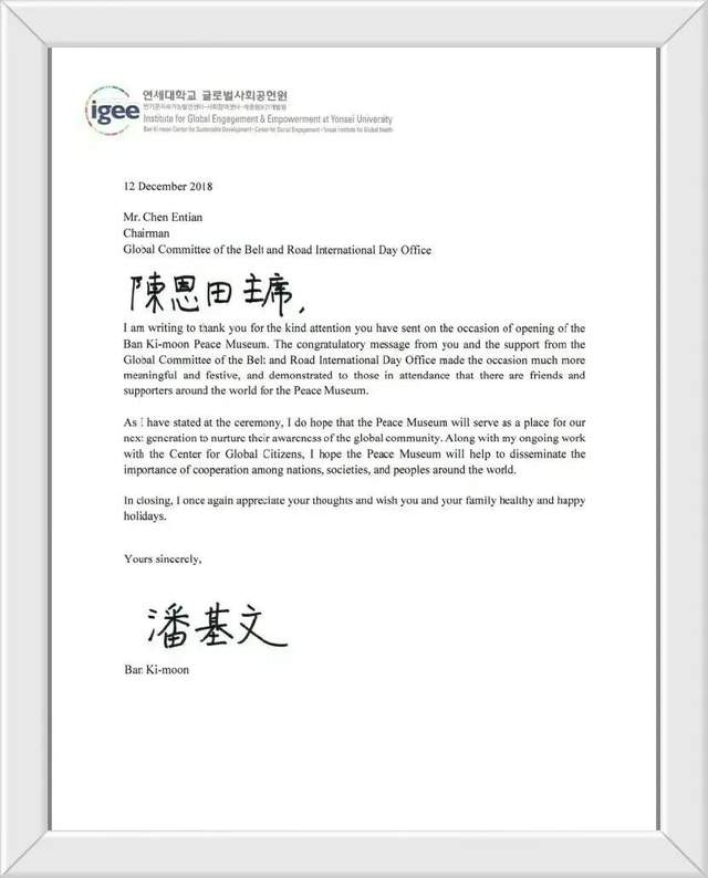 (图为联合国第八任秘书长潘基文先生写给世界和平丝带组织前主席陈恩田先生的亲笔签名信)