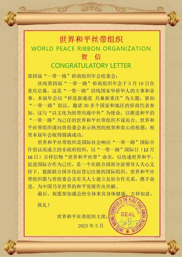 纳斯达克中文台1216国际广播,世界和平丝带组织纽约秘书处消息,中国当地时间2023年5月18日,第五届“西洽会”专场活动——第四届“一带一路”侨商组织年会在重庆召开。中国侨联党组成员、副主席连小敏,重庆市委常委、统战部部长卢红出席会议并致辞。受世界和平亲善大使、“可可亲王”陈恩田主席委托,世界和平丝带组织纽约秘书处致信祝贺第四届“一带一路”侨商组织年会圆满成功。